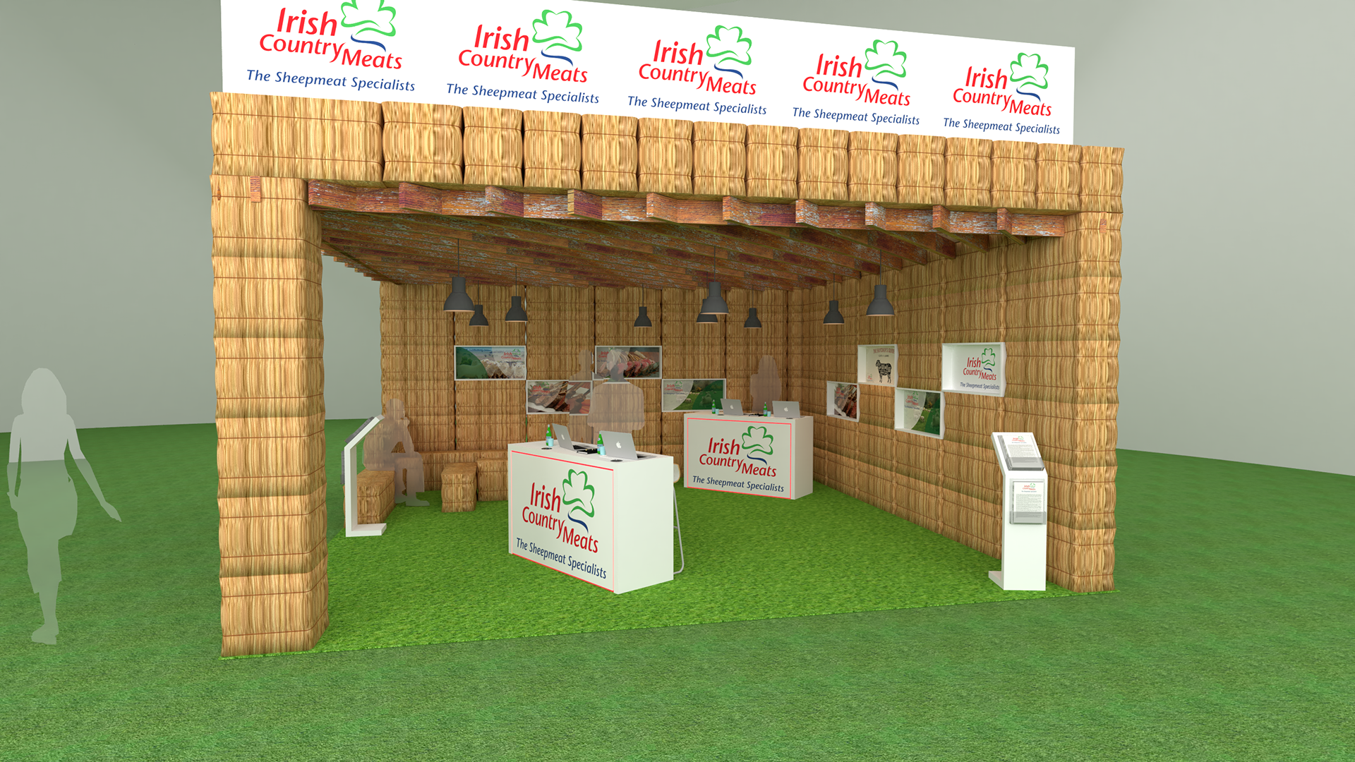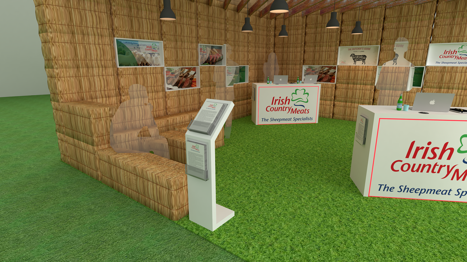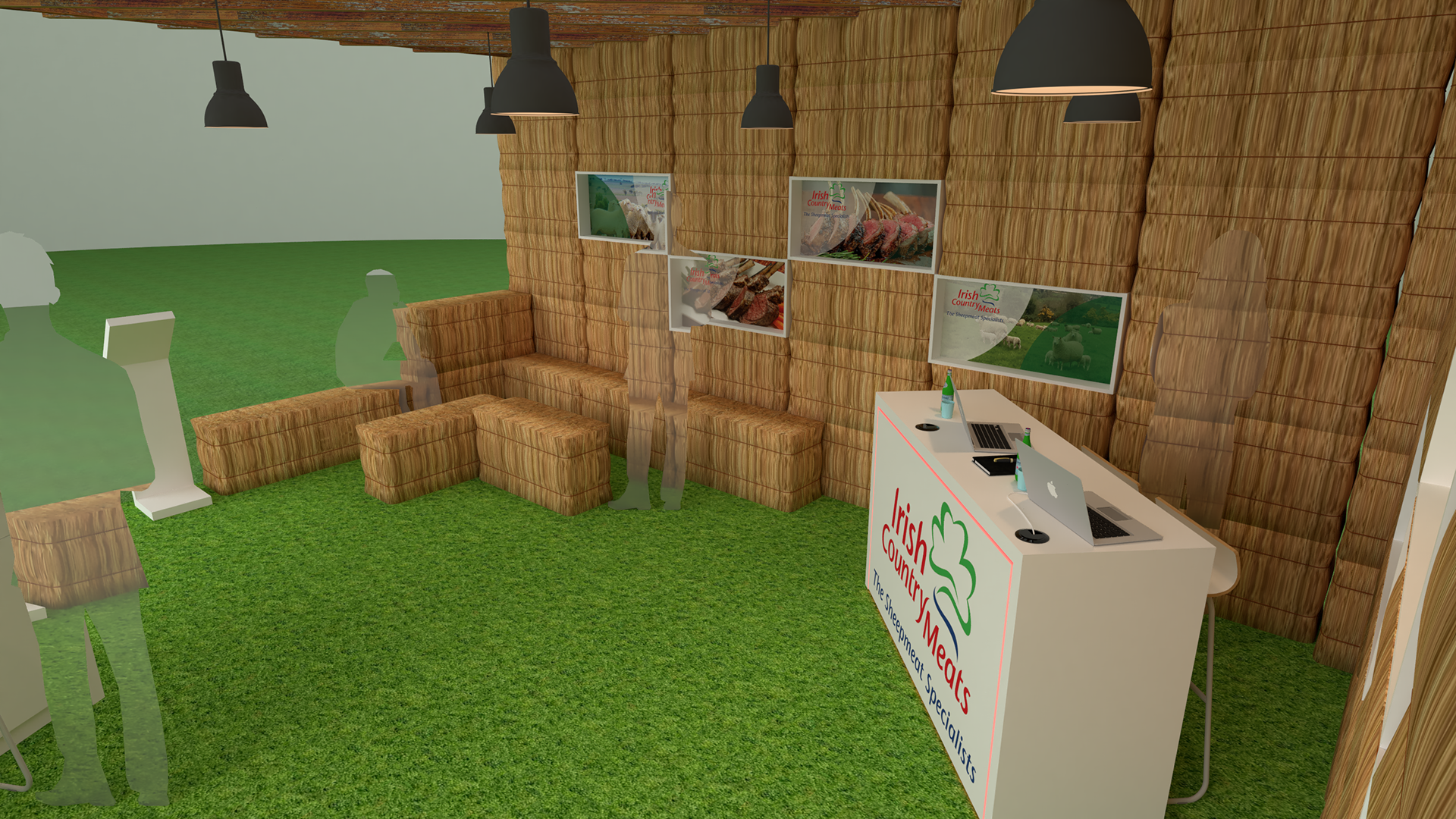 Concept design for Irish Country Meats pop up in fire retardant hay bails with seating areas.